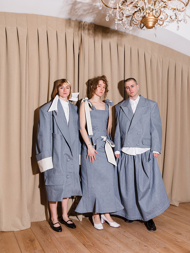 필로 케이스 드레스, 벽지 프린트 드레스 등 컨셉트를 직관적으로 드러내는 룩을 선보였다 컨셉트를 의상으로 표현하는 방식에 호기심을 갖고 있다. 테마가 담긴 옷이 베이식 아이템과 어우러지는 과정에서 스토리가 완성된다고 생각한다.