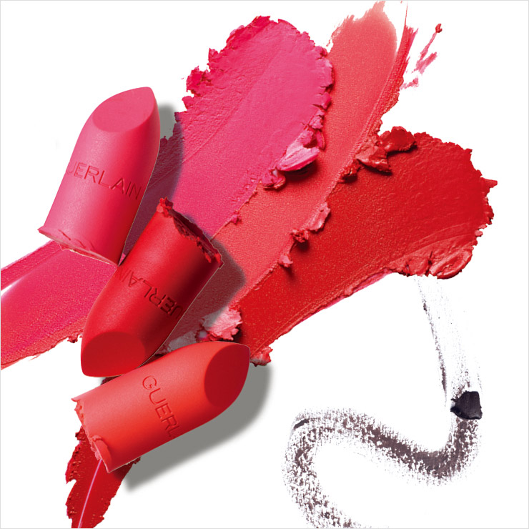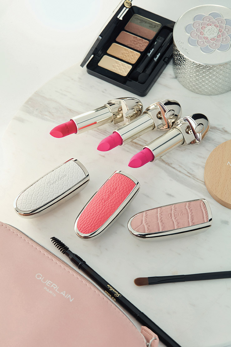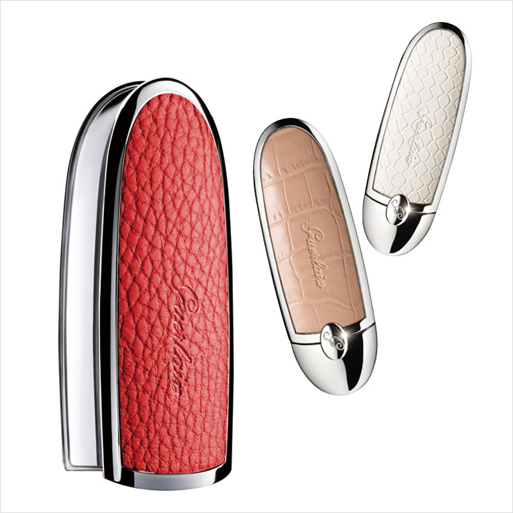 (위부터) 레더 패턴을 얹은 주얼리 케이스는 루즈 G 더블 미러 캡, 심플리 화이트, 임페리얼 루즈, 로지 누드, 각 2만5천원. 부드럽게 발리는 세미 매트 포뮬러로 입술을 도톰하게 만드는 플럼핑 효과를 준다. 루즈 G 립스틱 매트, N° 24, N° 40, N° 61, 각 3만8천원, 모두 Guerlain.