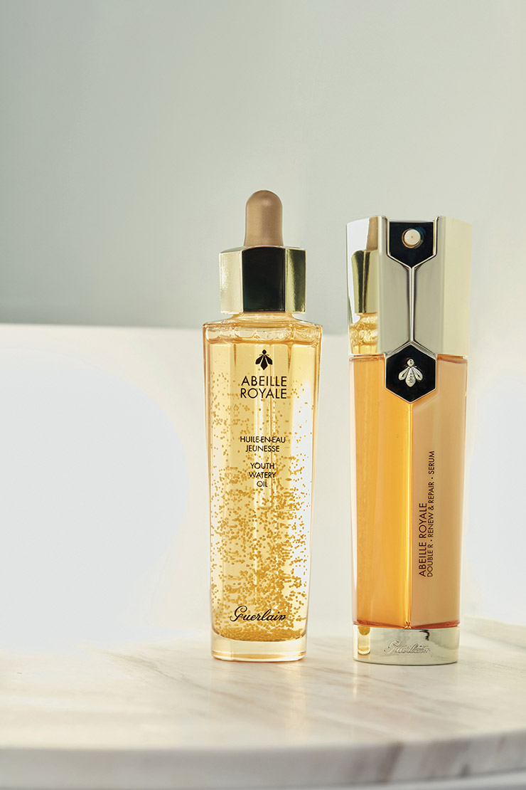 화장이 잘 받는 피부 상태로 만들어주는 산뜻한 오일은 아베이 로얄 유쓰 워터리 오일, 30ml 12만9천원, 50ml 19만원. 광채 세럼과 탄력 세럼이 반씩 펌핑돼 즉각적인 탄력을 부여하는 아베이 로얄 더블 R 세럼, 30ml 21만2천원, 50ml 28만4천원.