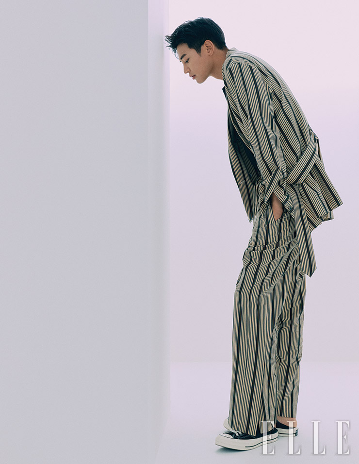 스트라이프 패턴의 재킷과 팬츠는 모두 Wooyoungmi. 안에 입은 블랙 티셔츠는 스타일리스트 소장품. 스니커즈는 Converse.