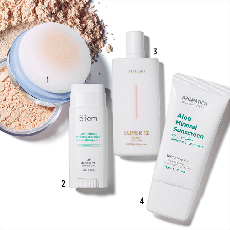 1 100% 천연 미네랄 성분으로 피부 자극 제로! 보송한 파우더 타입으로 드라이 샴푸, 데오도란트로도 활용해 볼 것. 내츄럴 100 더마 썬킬 미네랄 SPF 46/PA+++, 4만2천원, Catrin.