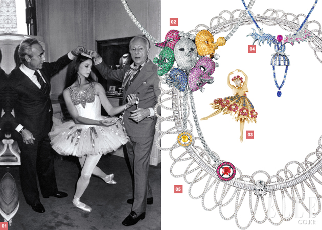 예술 작품에서 모티프를 얻어 주얼리가 탄생하기도 하지만 반대로 주얼리에 영감을 받아 예술 작품이 탄생하기도 한다. 20세기 최고의 발레안무가로 평가받고 있는 조지 발란신(George Balanchine)의 3막 구성 작품인 ‘주얼(Jewels)’이 바로 대표적인 예. 러시아 태생의 조지 발란신은 1961년 뉴욕 5번가에 위치한 반 클리프 앤 아펠 부티크 옆은 우연히 지나가다가 쇼윈도에 진열돼 있는 눈부시게 아름다운 에메랄드, 루비, 다이아몬드 주얼리에서 영감을 받아 총 3막으로 구성된 발레 ‘주얼(Jewels)’를 만들었다. 3막으로 구성된 최초의 발레 작품으로 평가받고 있는 ‘주얼(Jewels)’의 제 1막은 프랑스 파리의 로맨티시즘을 표현한 에메랄드, 제2막은 뉴욕의 역동성과 에너지를 표현한 루비, 제3막은 러시아의 세인트 피터스버그의 정통 발레의 클래식함을 표현한 다이아몬드로 구성됐다. 이렇게 탄생한 발레 ‘주얼(Jewels)’의 초연 60주년을 기념하며 2007년 런던 로열오페라하우스에서 론칭한 하이 주얼리 ‘발레 프레시유’ 컬렉션 또한 에메랄드, 루비, 다이아몬드 등 세 가지 라인으로 구성돼 있다. 눈부신 빛의 움직임 속에서 서로를 쫓아가는 발레리나의 스탭들, 아라베스크와 솟아오르는 비약 등의 동작들과 서정적인 동작 하나하나를 모티프로 만들어진 발레리나 클립은 1940년대 선보인 빈티지 피스들을 현대적으로 재해석했다.