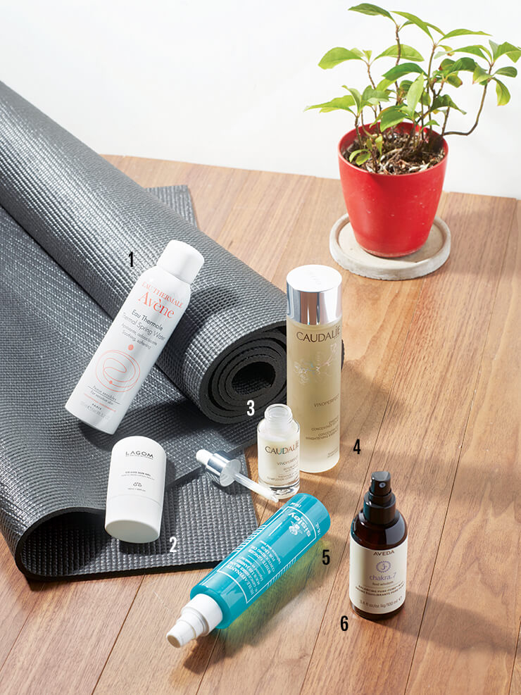 1 수련 후 붉게 달아오른 얼굴에 뿌려주는 온천수 스프레이. 끈적이지 않고 즉각적으로 피부 온도를 낮춰줘 여름철에도 좋다. 오 떼르말, 150ml 1만7천원, Avène.