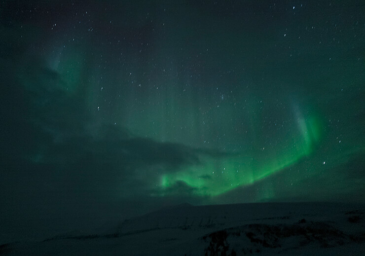 북위 69°에 살아도 북위 78°의 풍경이 궁금하다. 노르웨이에서 지낸 지 3년째, 해가 지지 않는 여름과 해가 뜨지 않는 겨울이 익숙해질 때쯤 지구 꼭대기로 떠나기로 했다. 노르웨이와 북극점 사이에 있는 5개의 섬을 묶은 스발바르(Svalbard) 제도. 바다도 얼어붙는 땅이자, 북극곰이 주인인 이 섬은 극한에 도전하는 탐험가의 성지다. 이곳에 다녀온 친구들은 거대한 북극곰이 얼마나 빠른 속도로 달려왔는지 무용담을 늘어놓았다. 모험의 하이라이트는 한밤중에 얼어붙은 계곡으로 떠나는 스노모빌 투어다. 스코틀랜드 출신의 베테랑 가이드는 한쪽 어깨에 구형 장총을 메고 우리를 안내했다. 아무도 밟지 않은 눈 위를 달리며 스피드를 만끽하던 가이드가 멈추면 야생 순록이 나타났거나 오로라를 발견했다는 뜻이다. 스발바르 순록은 작고 통통하고 못생겨서 더 귀엽다. 순록과 인간 무리는 한참 서로를 관찰하다가 ‘쿨’하게 제 갈 길을 갔다. 다음은 얼어붙은 폭포다. 혹한의 날씨는 흐르는 물줄기를 그대로 얼려버렸다. 핫 초콜릿을 마시며 잠시 숨을 고르는 사이 꽁꽁 언 폭포 위로 오로라가 나타났다. 모두가 동시에 숨을 멈춘 사이, 가이드는 더 멋진 오로라를 보여주겠다고 약속했다. 약속대로 한참을 달려 올라선 낮은 언덕, 전조등을 끄니 은하수와 오로라가 동시에 머리 위로 쏟아졌다. 우주가 쏟아져 내리는 기분이었다. 또 뭘 했더라. 빙하로 만든 맥주를 마시고, 빙하 동굴 안에 기어 들어가 세상에서 가장 깊은 침묵을 느끼고, 얼어붙은 바다 위를 걸어 다녔지만 잘 기억나지 않는다. 스노모빌을 타고 눈 위를 헤매며 본 장면들이 너무 강렬했기 때문이다. 눈을 감고 숫자를 거꾸로 헤아리면 최북단의 하늘이 다시 전방에 펼쳐진다. 다음 겨울엔 오로라보다 만나기 힘들다는 북극곰을 찾으러 갈 것이다. 김윤정(<아이슬란드 컬처 클럽> 저자)