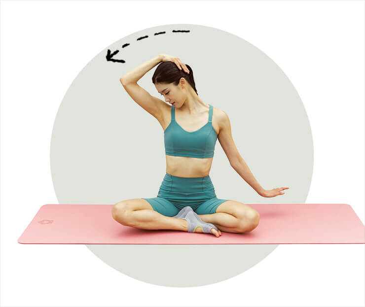 앉은 자세에서 왼쪽 팔을 사선 뒤로 뻗은 채 오른손으로 왼쪽 머리 뒤쪽을 잡고 오른 무릎 방향으로 고개를 숙여 뒷목을 늘려준 뒤 5초간 유지한다. 반대 방향도 반복.