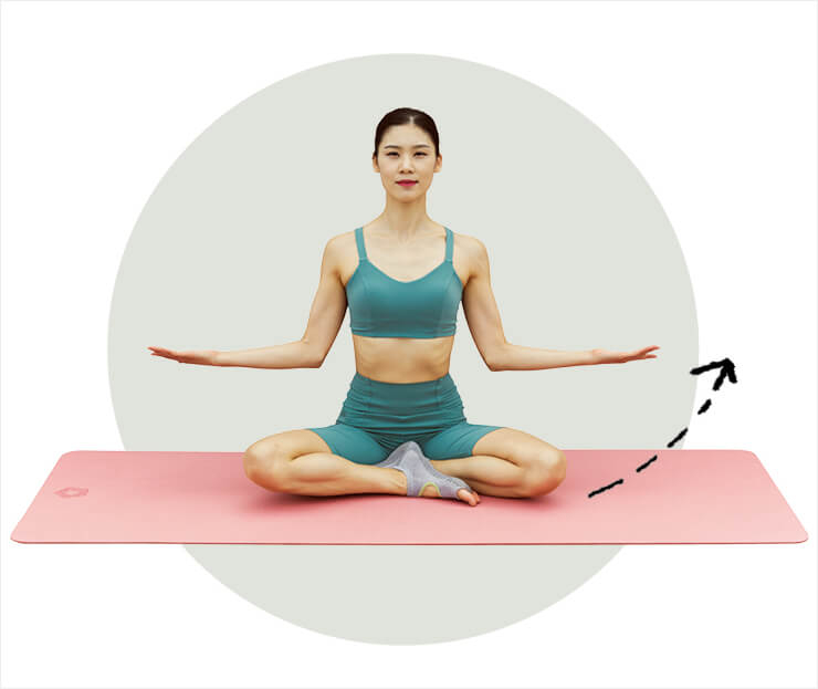 앉은 자세에서 양쪽 팔꿈치를 옆구리에 붙이고 손바닥은 앞 위로 향한다. 날숨에 손끝을 양옆으로 열어 ‘ㄴ’ 자 팔을 만들고, 가슴과 쇄골을 벌리듯 넓게 펴준다.