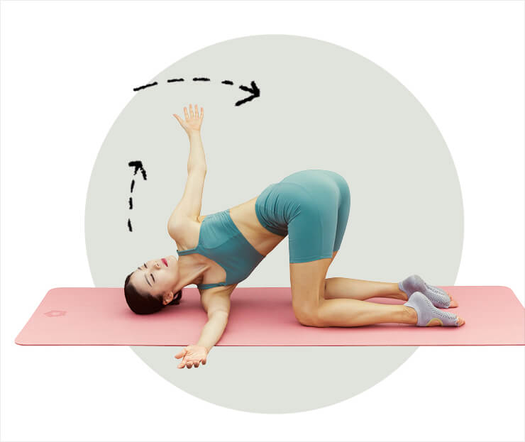 옆으로 누워 두 팔을 어깨 앞으로 뻗어 손뼉 치듯 모아준다. 들숨에 팔을 머리 위로 돌려주고, 날숨에 팔을 뒤로 뻗은 채 가슴을 늘려주며 되돌아온다. 반대 방향도 반복.