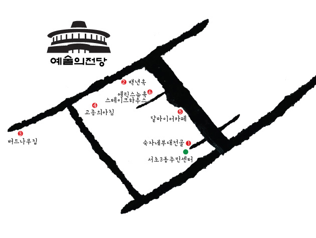 3.버드나무집 무언가를 관람하는 일에는 생각보다 많은 에너지가 쓰인다. 시선을 집중하고 골똘히 의미를 생각하다보면 움직임이 많지 않아도 어느새 속이 허하다. 늦은 아침, 예술의 전당으로 전시?공연을 보러 가기 전후엔 뱃속을 든든히 채워 줄 필요가 있다. ‘버드나무집’은 원래 고깃집이지만, 오전 10시부터 100그릇 한정으로 갈비탕을 판매한다. 푸짐한데다 육즙이 제대로인 한우를 사용한 이 집 갈비탕은 11시 반쯤 되면 모두 동난다고 하니 일찌감치 들르는 게 좋겠다. Tel 02-579-5900 Add 서울시 서초구 서초동 1425-12
