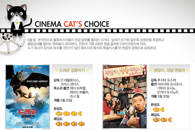 고양이 기지개 : 크레시다 코웰의 2003년 동명 동화가 원작. 환골탈태는 이런 경우에 해당하는 찬사다. 디즈니에서 작별하고 나와 성공한 인물은 팀 버튼이 아니라 앞으로 크리스 샌더스로 기억될 게 분명하다. <미녀와 야수>부터 <릴로와 스티치>까지 10년을 넘게 디즈니의 일등 작가로 군림했던 크리스 샌더스는 드림웍스로 넘어와 인트루 3D로 <드래곤 길들이기>를 탄생시켰다. '포스트 <아바타>'는 바로 <드래곤 길들이기>이다.