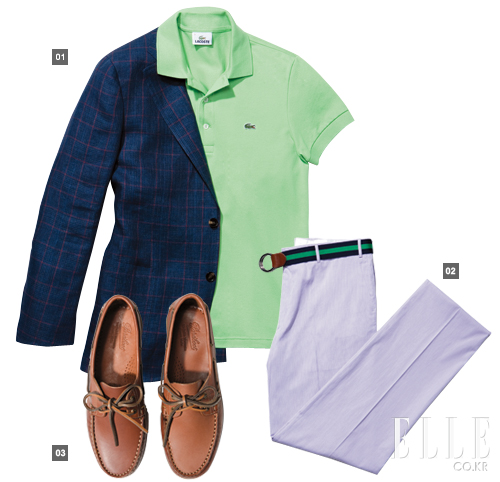 1 폴로 셔츠 9만원대 라코스테 체크 재킷 1백70만원 란스미어 2 리본 벨트 9만8천원 폴로 랄프 로렌 코드레인 팬츠 87만원 스테파노 리치 3 브라운 보트 슈즈 31만8천원 파라부트 by 일 치르꼬
