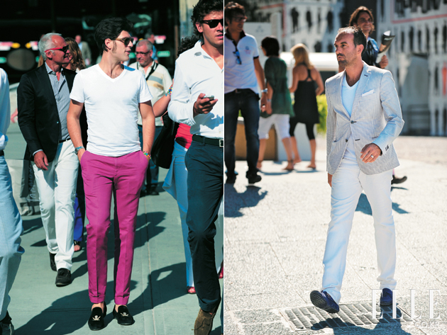 베이식하기로 따지자면 크루넥 티셔츠가 먼저지만 멋으로 따지자면 브이넥 티셔츠가 더 낫다. 피티 워모에 모여든 멋쟁이들이 선호하는 아이템 역시 다름 아닌 화이트 브이넥 티셔츠다. 요란한 프린트나 어설픈 구호 따위가 새겨진 건 촌스럽다는 불문율이라도 있다는 듯 한결같이 순수한 흰색 티셔츠를 입고 있는 것. 장식이라곤 왼쪽 가슴팍에 주머니가 달린 정도가 전부다. 데님 팬츠나 치노 팬츠와 입어 깔끔한 분위기를 유지하는 것이 관건. 사진 속의 남자처럼 과감한 컬러 팬츠를 매치하면 부담스럽지 않으면서도 임팩트 있는 룩을 연출할 수 있다.