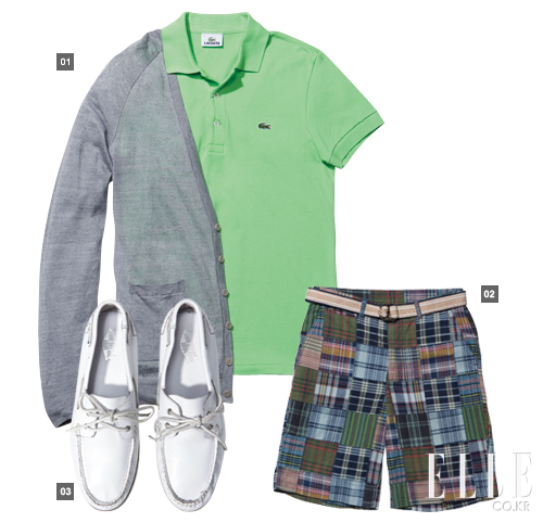 1 폴로 셔츠 9만원대 라코스테 그레이 카디건 29만8천원 띠어리 맨 마드라스 2 체크 반바지 14만8천원 폴로 랄프 로렌 리본 벨트 11만5천원 피오리오 by 일 치르꼬 3 화이트 보트 슈즈 8만9천원 반스