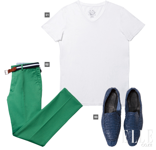 1 브이넥 티셔츠 9만8천원 BD 배기스 by 샌프란시스코 마켓 2 그린 치노 팬츠 43만원 란스미어 벨트 10만8천원 폴로 랄프 로렌 3 로퍼 54만원 듀칼 by 일 치르꼬