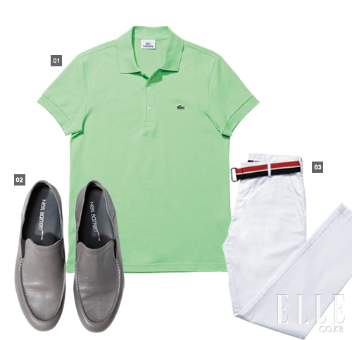 1 폴로 셔츠 9만원대 라코스테 2 화이트 치노 팬츠 16만8천원 리본 벨트 9만8천원 모두 타미 힐피거 3 그레이 슬립온 78만원 닐 바렛
