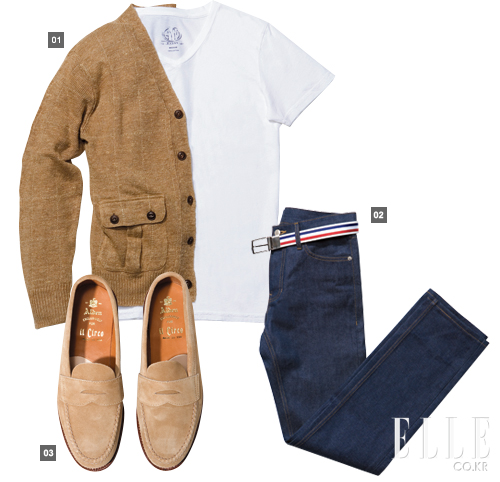 1 브이넥 티셔츠 9만8천원 BD 배기스 by 샌프란시스코 마켓 리넨 니트 카디건 42만8천원 폴로 랄프 로렌 2 생지 데님 팬츠 22만8천원 서상영 by MAN gds 스트라이프 벨트 6만5천원 올젠 3 스웨이드 페니 로퍼 72만9천원 알든 by 일 치르꼬