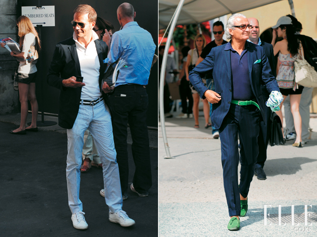 폴로 셔츠와 스포츠 재킷, 코드레인 팬츠의 조합은 이탤리언 스타일의 전형이다. 녹색 계열의 체크 패턴이 가미된 네이비 재킷과 리본 벨트를 활용하면 폴로 셔츠의 밝은 연두색과도 잘 어울린다. 바지를 롤업하고 보트 슈즈로 마무리! |