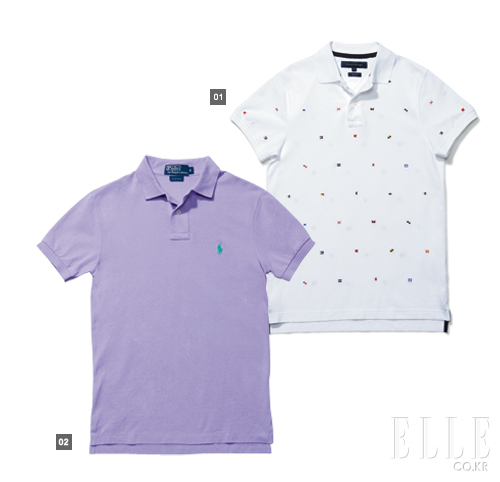 1 프레피한 분위기를 한껏 살려주는 패턴 폴로 셔츠. 13만8천원 타미 힐피거 2 화이트 팬츠와 잘 어울리는 연보라색 피케 조직의 폴로 셔츠. 9만8천원 폴로 랄프 로렌