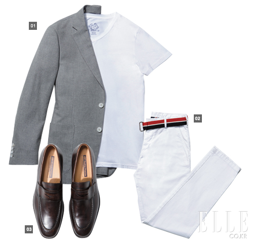 1 브이넥 티셔츠 9만8천원 BD 배기스 by 샌프란시스코 마켓 그레이 재킷 가격미정 마에스트로 2 화이트 팬츠 가격미정 질 샌더 벨트 23만3천원 토즈 페니 3 로퍼 10만9천원 호킨스 by ABC마켓