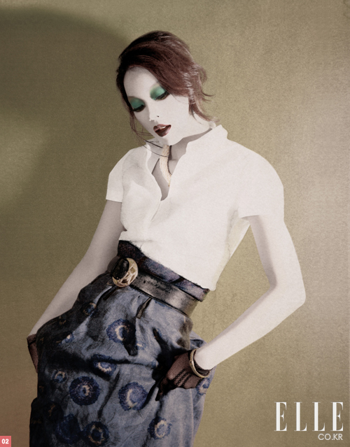 자연스럽게 흘러내린 머리카락과 우아한 몸짓이 시선을 사로잡는다. 청록색 아이섀도를 아몬드형으로 아이 홀에 전체적으로 펴발라준 후 밝은 라임 컬러를 눈썹 앞머리 부분에 툭툭 묻히듯 발라준다. 블랙 마스카라를 속눈썹에 여러 번 덧발라 더욱 풍성하고 짙은 속눈썹으로 연출한다. 립스틱을 바르기 전에 입술 주변에 컨실러를 발라 원래 색을 감추면 더 깔끔하고 짙은 입술을 연출할 수 있다. 화이트 셔츠는 피아자 셈피오네, 블루 스커트는 강희숙, 진주목걸이와 빈티지 벨트, 팔찌는 제이미 앤 벨, 꽃 모티프의 반지는 쥬시 꾸튀르. |