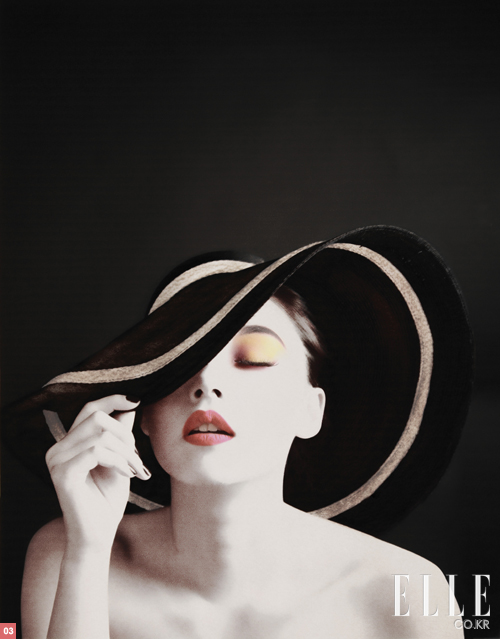 우아함을 완성하는 두 가지 요소, 챙 넓은 캐플린 햇과 꿈꾸는 듯한 표정이면 충분하다. 피부 톤보다 한 톤 밝은 컬러의 리퀴드 파운데이션을 얇게 펴바른 다음, 파우더를 덧발라 환하고 보송한 피부를 완성한다. 옐로 섀도를 아이 홀을 따라 전체적으로 발라주고, 눈 앞머리 부분과 꼬리쪽은 날렵한 형태로 잡아 그려준다. 언더 섀도 부분은 브라운 섀도로 연결하듯 발라준다. 브라이트너를 눈밑과 T존 부분에 덧발라 보다 진주처럼 화사한 피부 톤을 강조했다. 블랙 캐플린 햇. 꼬르티 by 쏘 쏠트. |