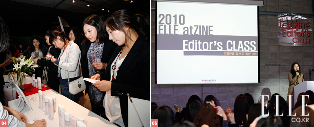4 클라란스의 신제품을 체험해본 지니 에디터들을 대상으로 즉석에서 진행된 설문조사. 5 ‘매거진 기획안 작성’이란 주제로 강의를 진행한 <엘르걸>의 이경아 편집장.