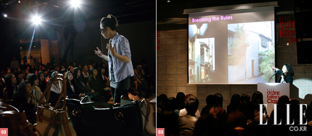 에디터 클래스의 시작을 알리는 사회자의 안내 멘트와 함께 총 20개 조로 편성된 지니 에디터들에게 바로 조별 미션이 주어졌다. 미션 내용은 빈폴과 클라란스 제품을 이용해 컨셉트에 맞는 기획안을 작성하는 것. 순간 조용하던 400여 명의 지니 에디터들이 술렁이기 시작했다. 갑자기 주어진 미션에 당황한 모습도 잠시, 10명 남짓으로 구성된 각 조원들은 분주하게 빈폴과 클라란스 부스를 오가며 사진을 찍고 취재를 하며 실제 기획회의를 방불케 하는 열띤 토론을 벌였다. 주어진 30분이 모두 지났을 때쯤 미션을 함께 수행한 지니 에디터들 사이에서 처음의 어색함은 자취를 감춰 한층 유연해진 분위기를 엿볼 수 있었다. 뒤를 이어 HEM KOREA 김원태 부회장의 환영사, 그리고 엘르 엣진과 지니 에디터의 파트너십과 향후 비전에 대한 마케팅 프레젠테이션이 끝난 후 본격적인 에디터 클래스가 시작되었다. 첫 번째로 <엘르>의 강주연 편집장이 ‘Creative Thinking’을 주제로 강연을 했다. 강주연 편집장은 에디터가 가져야 할 가장 중요한 덕목으로 창의적인 사고를 꼽으며 ‘Breaking Rules’와 ‘Risk Taking’, ‘Passion’을 통한 ‘CCC(Creative Contents Creator)’를 강조했다.