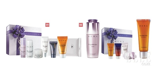 1 프리퍼펙션 세럼을 구입한 고객에게 화이트닝 세럼과 크림, 선메이트 데일리, BB 크림, 클렌징 클로스 등 퍼펙트 7종을 제공한다. 2 헤라의 선크림 중 한 품목을 구매하면 선메이트 데일리와 레포츠, 프리퍼펙션 세럼과 아쿠아볼릭 뉴트리티브 크림 등 4종을 증정한다.