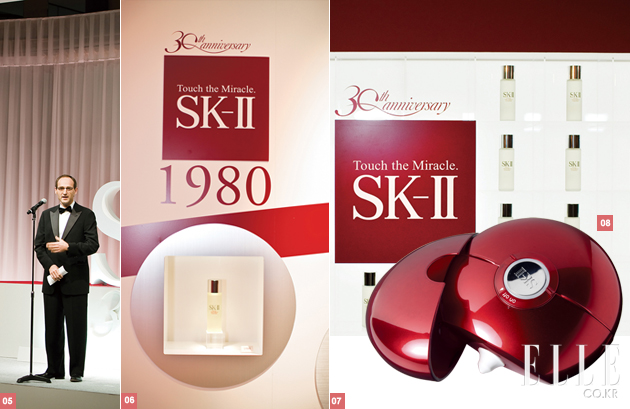 5 P&G 프레스티지 라인 부사장 패트리스 루베. 6 1980년 ‘피테라’의 시작을 알린 페이셜 트리트먼트 에센스. 7 SK-II의 30년을 한눈에 둘러볼 수 있었던 쇼케이스. 8 SK-II의 혁신적인 제품 중 하나였던 에어터치 파운데이션.