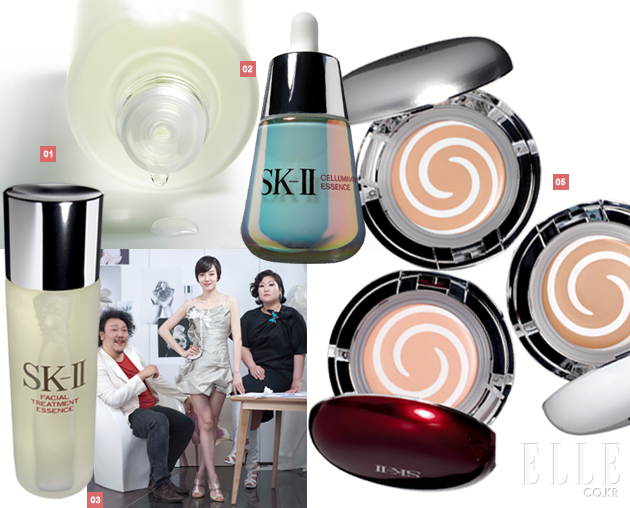 1 SK-II 페이셜 트리트먼트 에센스. (시계방향으로) 트랜스폼 파운데이션, 셀루미네이션 인 파운데이션, 화이트소스 스킨시그니처 크림 인 파운데이션