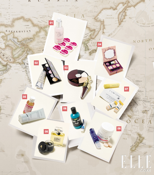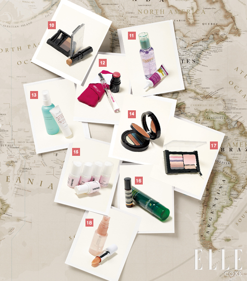 1 바닐라 코 렛미 스타트 메이크업 에센스 SPF 15/PA+ 하나만으로 베이스 메이크업을 뚝딱 해결하는 멀티 베이스. 2만5천원. 에이솝 미니 BB크림 캡슐처럼 1회 사용 분량만큼 개별 포장돼 있어 외출할 때 유용하다. 가격 미정. 2 록시땅 라벤더 핸드 크림 파우치에 쏙 들어가는 미니 사이즈의 라벤더 향 핸드 크림. 30ml 1만3천원. 안나수이 돌리걸 아이 팔레트 베이스와 포인트까지 꼭 필요한 다섯 가지 컬러를 하나로 담았다. 가격 미정. 3글램3 플로리스 HD 컨실러 키트 눈가를 밝혀주는 브라이트너와 컨실러 키트. 3만2천원. 겔랑 테라코타 콜 루스 파우더 미라지 새끼손가락만한 앙증맞은 사이즈의 브라운 섀도. 4만4천원. 4 네피트 컨페션 오브 어 컨실러홀릭 비행기에서 내리기 전 칙칙해진 얼굴에 터치해 피부를 밝혀줄 것. 5만8천원. 5 터 브로너스 로즈 퓨어 캐스틸 솝 기내에서 세수하고 싶을 때를 대비해 챙기면 좋은 물비누. 59ml, 4천원. 디올 뷰티 어웨이크닝 리하이드레이팅 마스크 바르고 물티슈로 닦아낼 수 있어 간편한 수분 마스크. 4만9천원. 6 러쉬 럽럽럽 자리를 많이 차지하지 않는 미니 사이즈의 각질제거 겸용 샤워 젤. 100g 1만4천5백원. 피토 세븐 데일리 하이드레이팅 크림 헹궈낼 필요가 없어 간편한 헤어 전용 수분 크림. 10ml, 5개, 3만8천원. 7 멘소래담 아크네스 포인트 클리어 여행 피로로 인한 뾰루지를 잡아주는 스틱. 9천5백원. 랑콤 프리모디알 아이 컨투어 클로스 마스크 지친 눈가를 탱탱하게 가꿔주는 시트 마스크. 8만8천원. 뉴트로지나 딥클린 블랙 헤드 워밍 트리트먼트 스물스물 올라온 블랙 헤드를 깔끔하게. 6개, 2만2천원. 8 랑콤 잉크 아트라이너 번짐 없이 깊은 눈매를 연출하는 미니 젤 아이라이너. 3g, 3만4천원. 샤넬 N.5 빠르펭 전설적인 향을 어디서나 즐길 수 있는 미니어처 향수. 7.5ml, 16만5천원. 9 아베다 블루 오일 밸런싱 컨센트레이트 릴랙싱 효과의 아로마 오일은 좁은 이코노미 좌석의 필수품. 1만9천원. 뷰티인 멀티 비타민& 미네랄Wh 피로를 느낄 땐 틈틈이 비타민 보충을. 30정, 2만원. |