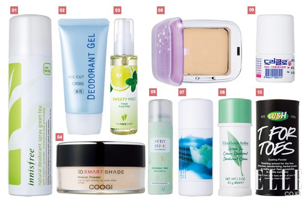 1 유기농 라벤더와 캐머마일, 위치하젤 성분이 땀으로 인해 자극받은 피부를 순하게 케어해주는 내추럴 데오도란트 스프레이 그린 티. 150ml. 9천원. 이니스프리. 2 파우더가 배합되어 산뜻한 기분을 느끼게 해주는 데오도란트 젤. 35g. 1만5천원. 오르비스. 3 라임 트리 워터와 솔잎 추출물이 함유되어 땀으로 인한 불쾌한 냄새를 제거해주는 스위티 민트 후레쉬 풋 미스트. 70ml. 4천5백원. 더페이스샵. 4 3D 스마트 쉐이드 미네랄 파우더. 다공성 파우더가 피지와 땀을 효과적으로 흡수해주는 것이 장점이다. 30g. 2만9천원. 쿠지. 5 땀과 피지로 인한 번들거림을 제거해주는 마끼아쥬 래스팅 파우더리 UV EX SPF 22 PA++ OC20호. 10g. 6만5천원. 시세이도. 6 로즈메리, 녹차 추출물이 함유되어 피부에 자극 없이 순하게 작용하는 쁘띠비쥬 베이비버블 데오도란트 스프레이. 50ml. 4천5백원. 에뛰드 하우스. 7 민트와 로터스 플라워의 아로마 향이 일품인 로빠겐조 프레시 데오도란트 스틱 알코올 프리. 50ml. 3만원. 겐조. 8 땀에 강하며 시간이 지나도 상쾌한 향기가 오랫동안 지속되는 그린티 크림 데오도란트. 40ml. 2만원. 엘리자베스 아덴. 9 땀 발생을 억제해 하루 종일 보송보송한 피부를 유지시켜주는 드리클로.1만3천원. 한국 스티펠. 10 라임과 허브가 불쾌한 발 냄새를 말끔히 제거해주는 티포토즈. 100g. 2만1천원. 러쉬.
