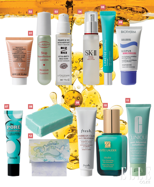 1 시슬리 마스끄 끄렘므 오 레진느 뜨로삐깔 125,000 피부 정화 기능의 카올린 성분 함유, 60ml. 2 클라란스 블레미쉬 컨트롤 30,000 트러블을 즉각적으로 완화시키는 스팟 트리트먼트, 사용이 간편한 롤러 타입, 5ml×2. 3 록시땅 라이스 울트라 매트 페이스 플루이드 40,000 매티파잉과 리밸런싱 작용의 카마르그 적미 추출물 함유, 30ml. 4 SK-II 페이셜 클리어 솔루션 98,000 피지 분비 조절 기능이 뛰어난 천연 해양 추출물 세버 마린 콤플렉스 함유, 산뜻하게 발리는 젤 타입 텍스처, 100ml. 5 라네즈 포어 클리어링 에센스 27,000 포어 퓨리파잉 콤플렉스 시스템이 모공 속 피지와 노폐물을 제거하고 트러블을 예방해줌, 20ml. 6 비오템 비오쀼르 SOS 노멀라니저 모이스춰라이져 38,000 글리시리직산 성분이 트러블 발생을 예방, 피부 표면을 매끄럽게 가꾸어줌, 50ml. 7 베네피트 더 포어페셔널 42,000 매끈하고 보송보송한 피부로 연출하는 프라이머, 실리콘 성분이 유분을 흡수하고 모공을 감춰줌, 9.5g. 8 로얄 네이처 아톨러지 DF 비누 14,000 로얄네이처와 KIST 천연연구소가 공동 개발, 뛰어난 항균 작용의 몽골 천연 야생초 DF 성분과 천연 이센셜 오일 함유, 100g. 9 프레쉬 엄브리안 클레이 페이스 트리트먼트 91,000 딥 클렌징 효과의 마스크, 100ml. 10 에스티 로더 아이디얼리스트 포어 미니마이징 스킨 리휘니셔 130,000 글루코사민 추출물이 축적된 피지를 제거하고 모공 크기를 줄여줌, 50ml. 11 크리니크 안티 블레미쉬 솔루션즈 클리어링 모이스춰라이저 32,000 블로킹 테크놀로지가 여드름이 생기기 쉬운 요소들로부터 피부를 보호해줌, 50ml. 12 안나 수이 오일 컨트롤 페이퍼 8,000 과도한 피지를 깔끔하게 흡착함, 80매.