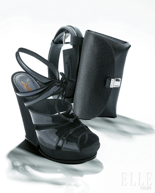 YSL과 루이 비통 컬렉션이 매력적인 이유는 아이러니에서 출발한다. 오로지 우아하기만 하거나 시크하기만 한 컬렉션은 아름다움 그 이상의 매력이 없다. YSL과 루이 비통에서는 세련된 반어법과 풍자, 해학이 보기 좋게 가미되어 반짝이는 유머와 감탄할 만한 스마트함이 감지된다. YSL의 프리폴 컬렉션을 위해 스테파노 필라티가 만들어낸 스트랩 웨지힐은 과장된 힐 셰이프와 발등을 조이는 가늘고 굵은 스트랩으로 페미닌함과 스포티함을 동시에 담아냈다. 한두 가지 수식어로는 쉽게 정의할 수 없는 YSL 특유의 페미닌함이 경쾌한 스포티즘과 섬세한 밀리터리 무드와 결합되어 새롭게 정의된 것이다. 클래식한 슈트에 고급스러운 레더로 제작한, 그러나 스포티할 수밖에 없는 힙색을 매치한 루이 비통 역시 같은 맥락이다. 특별한 아름다움은 아이러니가 동반될 때 한층 매력적이다. |