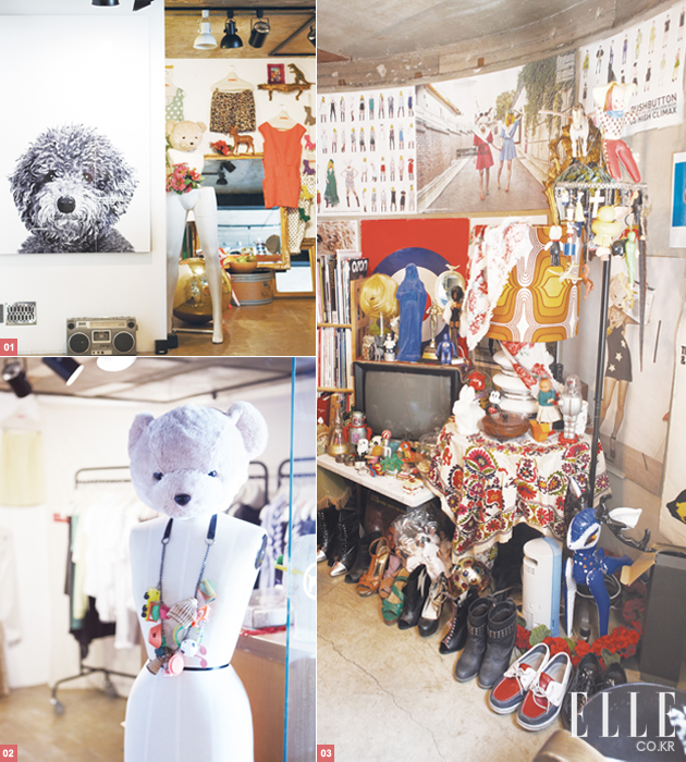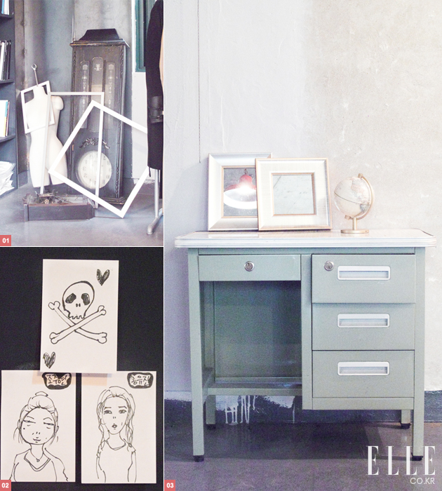 1 컨템퍼러리 아트 작품 같은 빈티지한 소품. 2 디자이너 조주연과 송유진의 캐리커처. 3 옛스러운 책상에서 빈티지한 감성이 느껴진다.