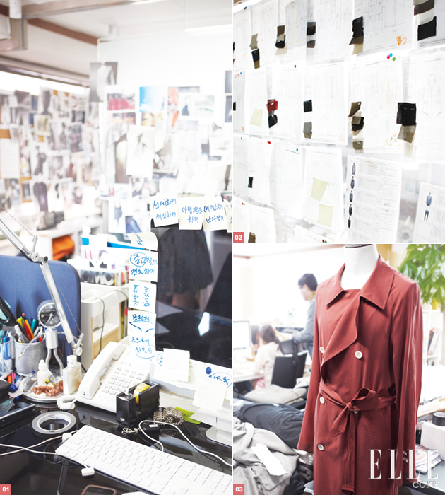 1 모던한 감성이 느껴지는 디자이너 신재희의 책상. 2 창문에 빼곡히 붙어 있는 작업지시서. 3 재희신의 트렌치코트.