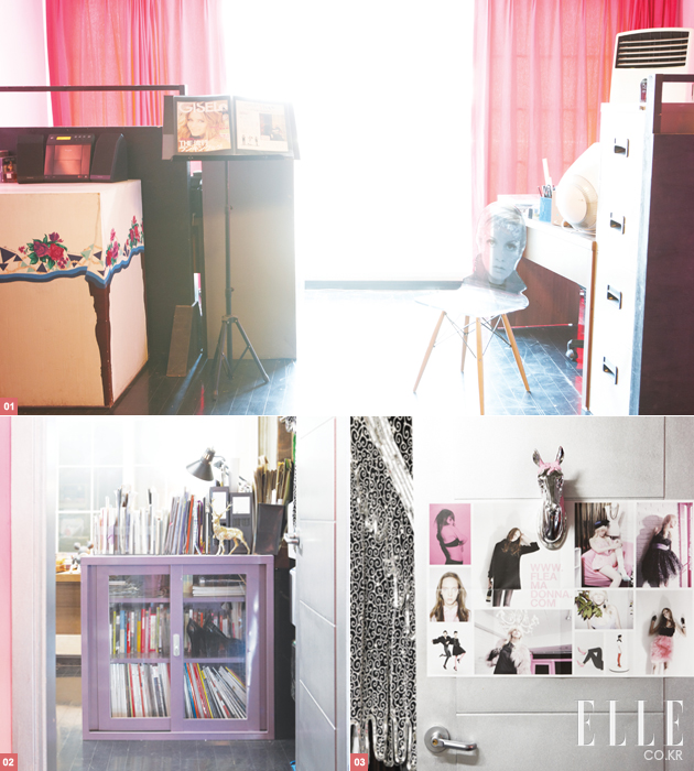 1 핑크 실내가 묘한 분위기를 자아내는 프리마돈나의 아틀리에. 2 디자이너 김지은의 책장과 책상. 3 프리마돈나의 아카이브를 담은 팸플릿.