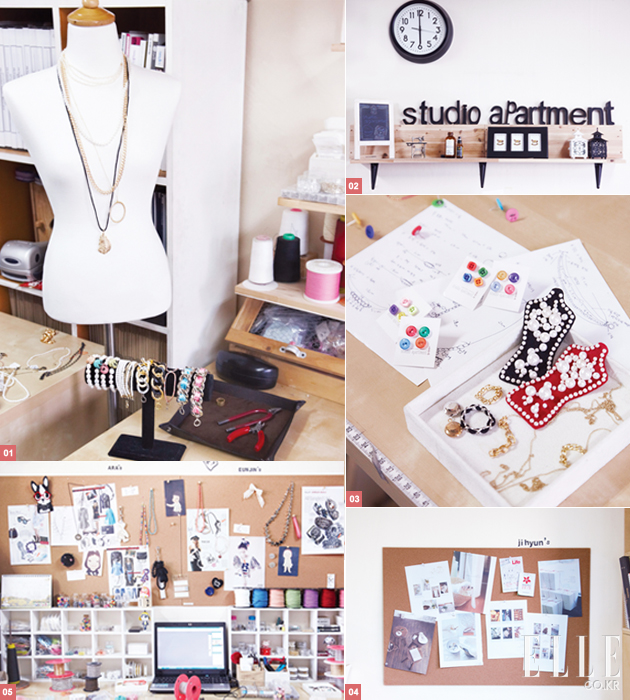10평 남짓한 공간엔 디자이너 셋이 옹기종기 등을 맞대고 앉아 각자의 작업에 열중이다. ‘스튜디오 아파트먼트(Studio Apartment)’의 크리에이티브 디렉터 안지현은 전문적으로 주얼리를 공부한 적은 없지만, 의류학과를 졸업하고 패션 브랜드를 홍보했던 이력이 오히려 스튜디오 아파트먼트만의 아이덴티티를 설계하는 데 도움이 됐다. 소재와 컬러의 조화, 트렌드와 클래식의 조율, 실용성과 디자인의 균형 등 주얼리 역시 패션 월드에서 비슷한 사이클과 고민을 안고 창작해내는 작업이기 때문. 스튜디오 아파트먼트 디자인에서 발견할 수 있는 소녀스러운 감성은 아틀리에 곳곳에도 묻어 있다. 디자이너 각자의 이름이 붙은 보드엔 좋아하는 이미지와 영감을 주는 부자재들이 자유롭게 걸려 있으며, 직접 골라 배치한 원목 소재의 심플한 책상과 빈티지한 서랍장에서는 안지현이 추구하는 앤티크한 감성이 묻어난다. 평소 나라 요시모토의 작업과 소박하고도 걸리시한 일본 아트북을 좋아해 거기서 발췌한 이미지들이 보드와 벽면을 장식하고 있으며, 여기서 비롯된 영감은 스튜디오 아파트먼트의 디자인에도 지대한 영향을 미친다고. 체인과 진주는 스튜디오 아파트먼트를 대표하는 재료로, 터프한 체인은 달콤한 파스텔 컬러를 입고 오히려 페미닌한 액세서리로 재탄생되며, 올드한 진주는 걸리시하고 키치한 주얼리로 탈바꿈되곤 한다. 그리고 이런 흥미로운 충돌과 아이러니가 디자이너 안지현이 꿈의 아틀리에에서 만들어내는 스튜디오 아파트먼트의 세계이기도 하다.