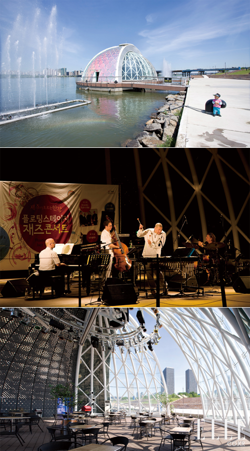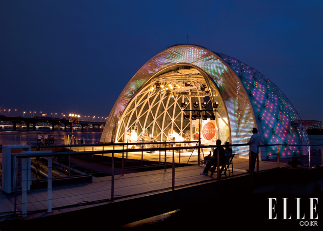 한강은 지금 새로운 조형의 플로팅 구조물로 변화를 꾀하고 있다. ‘플로팅’(floating)이란 부유체란 의미를 갖는 건축테마이다. 현재 반포지구 인근 한강변에서는 플로팅 아일랜드(floating island) 공사가 한창 진행 중이다. 세 개의 인공섬으로 이루어진 구조물로서, 완공되면 문화집회시설 및 근린생활시설의 용도로 활용될 예정이다. 꽃을 형상화 한 비정형의 구조물로 디자인되었다. 그리고 오늘의 주인공, 플로팅 스테이지(floating stage)가 있다. 이제껏 한강변에서 보아온 바지선 위의 레스토랑들은 선박의 모습을 띠고 있거나, 그저 그런 수준의 박스형 외관으로 세인들의 주목을 끌지 못했다. 대체로 선상 음식점 등의 이미지만 있었을 뿐, 조형적으로 시민들의 관심밖에 있었다. 해상건축의 역사는 19세기 초엽으로 거슬러 올라간다. 산업혁명 이후 자연을 극복할 수 있는 막강한 힘을 지니게 된 인간은 언제나 두려움의 대상이었던 바다를 인간의 원초적인 욕구를 만족시켜주는 새로운 대지로 활용하기에 이른다. 일찌감치 해변의 매력을 발견하고 특별한 곳으로 만든 것은 영국인들의 몫이었다. 그들은 피어(pier)건축과 해변리조트시설로 이 새로운 건축의 테마를 부흥시켰다. 빅토리아여왕 시대에 시민들의 여가 할동에 대한 의식이 고조되었고, 한편으로는 철도의 발달로 전국이 1일 생활권으로 묶이면서 해양건축은 20세기 중반까지 번성했다가 2차 세계대전 이후 점차 몰락의 길로 접어들었다. 선박 및 항공편 등 새로운 교통수단의 발달로 해외여행이 자유로워진 것도 쇠퇴하게 된 또 다른 이유다. 영국에서 발흥한 바다와 하천을 이용한 리조트시설의 조성은 육지에 기반한 건축에서 기대하는 것 이상의 흥미로운 주제로 부각되어 북유럽해안, 지중해 연안, 미국과 일본, 아시아 권역으로 확산되었다. 현재까지 피어건축은 아시아 여러 나라에 잔교의 형태로 남아 있다. 플로팅 스테이지. 물 위에 떠 있는 딱정벌레를 닮은 야외공연장이다. 건축가(윤창기, 경암건축 대표)는 이 구조물의 디자인을 물방울에서 힌트를 얻었다고 말한다. 이 같은 수상건축물은 건축법이 아닌 선박법의 저촉을 받는다. 땅에 고정되어 있는 건물이 아니고 물 위에 떠 있는 배와 같다는 이유다. |