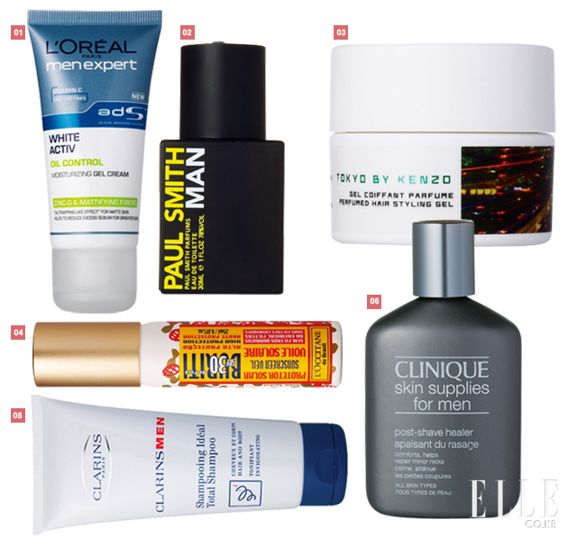 1 화이트 액티브 오일 컨트롤 모이스처라이징 젤 크림. 50ml. 1만5천원. 로레알 파리. 2 폴 스미스 맨 오 드 투알렛. 30ml. 4만3천원. 폴 스미스. 3 도쿄바이겐조 퍼퓸 드 헤어스타일링 젤. 100ml. 3만2천원. 겐조. 4 선스크린 베일 하이 프로텍션 SPF 30. 25ml. 3만5천원. 록시땅. 5 샴푸 앤 샤워. 200ml. 3만3천원. 클라란스. 6 SSFM 포스트 쉐이브 힐러. 75ml. 3만2천원. 크리니크.