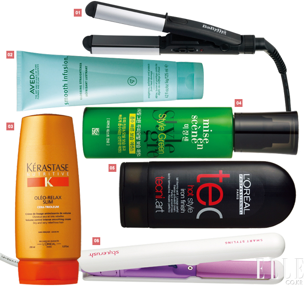 1 스트레이트너 겸용 유컬 디지털 셋팅. 3만8천원대. 바비리스. 2 스무쓰 인퓨전 글로싱 스트레이트너. 125ml. 3만9천원. 아베다. 3 올레오 릴랙스 슬림. 200ml. 4만8천원. 케라스타즈. 4 스타일그린 두피 모발 보습 에센스. 100ml. 1만1천원대. 미쟝센. 5 핫 아이론 피니쉬. 150ml. 2만4천원. 로레알 프로페셔널 파리. 6 스타일러쉬 러블리 바이올렛. 150g. 5만9천원. 스타일러쉬