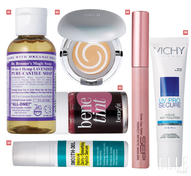 1 라벤더 퓨어 캐스틸 솝. 59ml. 4천원. 닥터 브로너스. 2 셀루미네이션 에센스 인 파운데이션. 420호. 10.5g. 6만원대. SK-II. 3 베네틴트. 12.5ml. 4만5천원. 베네피트. 4 스무드 365. 50ml. 6만2천원. 굿스킨. 5 퍼펙트 아티스틱 마스카라 1호. 5.5ml. 2만5천원. 셉. 6 UV 프로시큐어 SPF 40 PA+++. 30ml. 3만4천원대. 비쉬.