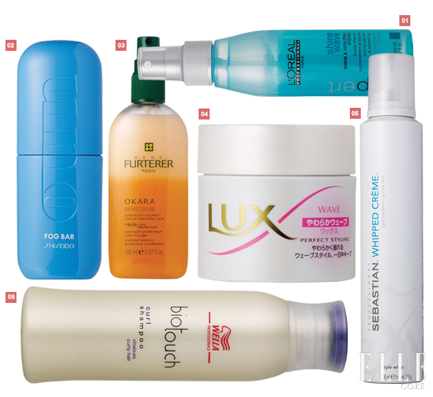 1 샤인 웨이브 듀얼 에센스. 125ml. 2만2천원. 로레알 프로페셔널 파리. 2 우노 포그 바 블루. 100ml. 1만2천원. 시세이도. 3 오카라 프로텍트 컬러 2 페이스. 150ml. 3만9천원. 르네 휘테르. 4 프리미엄 스타일링 내추럴 웨이브 왁스. 70g. 1만4천원대. 럭스. 5 바이오터치 컬 샴푸. 250ml. 1만원대. 웰라. 6 무스 타입 트리트먼트 윕크림. 150ml. 3만원대. 세바스챤 프로페셔날.