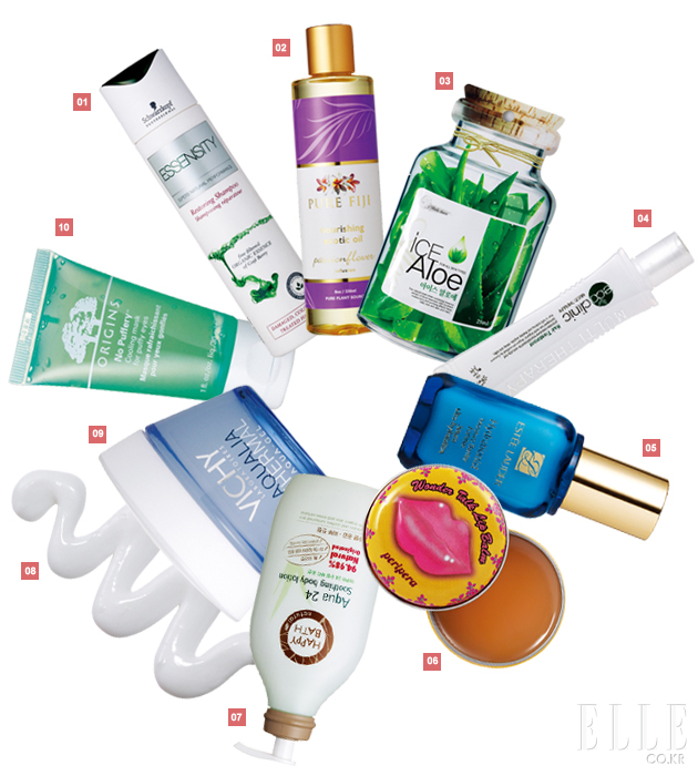 1 리페어 샴푸. 250ml. 3만2천원. 에센시티. 2 너리싱 에조틱 오일 패션 플라워. 236ml. 6만5천원. 퓨어피지. 3 데일리 프레쉬 마스크 아이스 알로에. 25ml. 2천원. 보브. 4 에코 크리닉 멀티테라피 헤어 트리트먼트. 160ml. 1만5천원대. 꽃을든남자. 5 하이드레셔니스트 모이스춰 배리어 포티파이어 세럼. 50ml. 13만원. 에스티 로더. 6 원더 톡 립밤 1호. 10g. 6천원대. 페리페라. 7 유기농 알로에 성분과 레몬 버베나 추출물이 함유된 아쿠아 24 수딩 바디 로션. 450ml. 1만6천원. 해피바스. 8 인텐시브 레스큐 수딩 핸드크림. 50ml. 5천원대. 바세린. 9 아쿠알리아 떼르말 아이스 쿨링 아쿠아-젤. 50ml. 4만원대. 비쉬. 10 부은 눈을 즉각적으로 가라앉히는 노 퍼퍼리 쿨링 마스크. 30ml. 3만8천원. 오리진스.