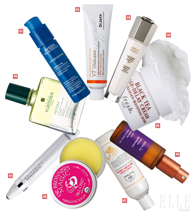 1 인브라이튼먼트 브라이트닝 코렉팅 세럼. 30ml. 9만원. 아베다. 2 V7 비타 레이저. 30ml. 4만8천원. 닥터자르트. 3 안티에이징 케어를 위한 아베이 로얄 유쓰 세럼. 30ml. 18만1천원. 겔랑. 4 헤어 폴 클리닉 두피 마사지 크림. 185g. 1만원대. 헤드&숄더. 5 블랙 티 크림. 30g. 15만5천원. 프레쉬. 6 아로마 룸 앤 린넨 미스트 라벤더. 30ml. 3만5천원. 아말라. 7 허니레몬 헤어테라피 샴푸. 270ml. 2만원. 로얄 네이처. 8 건조한 부위에 두루 사용할 수 있는 매직 오가닉 밤 로즈. 14g. 1만3천원. 닥터 브로너스. 9 코럴 워터 화이트 디펜스 스팟 인텐시브 케어. 30ml. 4만5천원. 쿠지. 10 혈액순환을 촉진하는 두피 스케일링 아스테라 플루이드. 50ml. 7만9천원. 르네 휘테르.