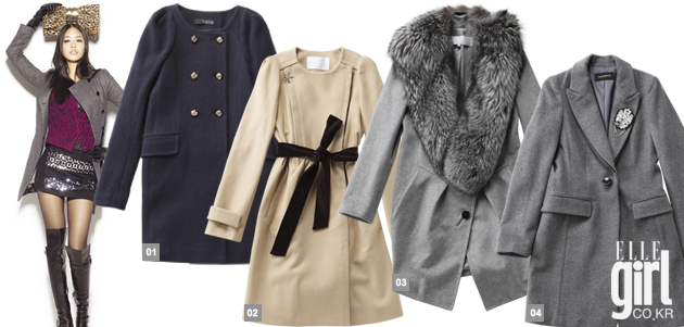 1 레이디 스타일의 미니멀한 디자인이 돋보이는 네이비 코트. 가격 미정. 플라스틱 아일랜드. 2 웨이스트의 포인트 리본 장식이 여성스러운 베이지 롱 코트. 25만9천원. 에린 브리니에. 3 청키한 퍼 칼라를 탈착할 수 있는 그레이 컬러 셔링 코트. 가격 미정. 오브제. 4 테일러드 칼라가 클래식한 원 버튼 슬림 코트. 가격 미정. 스위트 숲.