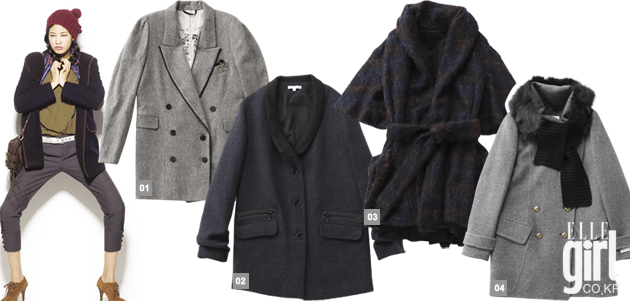 1 볼륨 소매와 박시한 피트가 구조적인 테일러드 코트. 가격 미정. 에린 브리니에. 2 보이시한 무드를 낼 수 있는 숄 칼라 하프 코트. 82만9천원. 바쉬. 3 아방가르드한 칼라 디테일과 빅 포켓이 특징인 브라운 코트. 가격 미정. 탱커스. 4 퍼 머플러를 탈착할 수 있는 울 소재 밀리터리 코트. 62만5천원. SJ SJ.