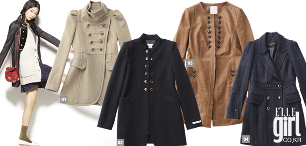 1 더블 브래스티드 디테일의 네이비 스트라이프 코트. 가격 미정. 96NY. 2 슬림한 라인이 돋보이는 모직 소재 네이비 밀리터리 코트. 49만5천원. SJ SJ. 3 셔링 잡힌 소매가 독특한 브라스 버튼 베이지 코트. 가격 미정. 에고이스트. 4 카보숑 버튼 디테일이 특징인 캐멀 컬러 레더 소재 밀리터리 코트. 1백19만8천원. 오즈세컨.