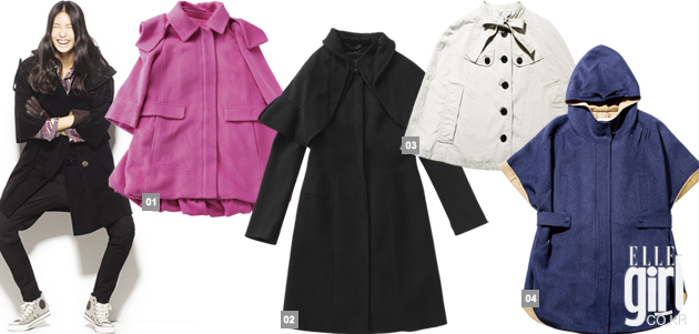 1 빅 케이프 칼라를 덧대 걸리시한 네이비 코트. 89만5천원. 마인. 2 밑단의 셔링 디테일이 독특한 프티 케이프 디테일의 핫 핑크 코트. 가격 미정. 96NY. 3 베이지 컬러가 포인트로 배색된 후드 디테일의 케이프 코트. 49만5천원. SJ SJ. 4 네크라인의 리본 디테일이 큐트한 클래식한 디자인의 케이프. 가격 미정. 버버리 런던.