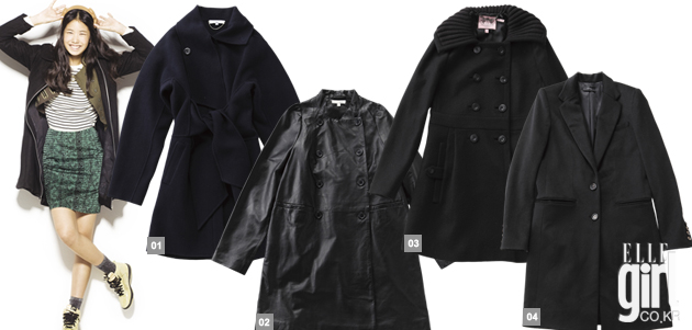1 절개선 없는 소매와 둥근 셰이프가 특징인 울 소재의 박시 코트. 가격 미정. 바네사 브루노. 2 다양한 스타일링이 가능한 더블 브레스티드 블랙 레더 코트. 가격 미정. 바쉬. 3 니트 칼라 디테일의 클래식한 모직 소재 블랙 코트. 가격 미정. 쥬시 쿠튀르. 4 베이식한 디자인의 슬림한 블랙 코트. 1백40만원대. 조셉.