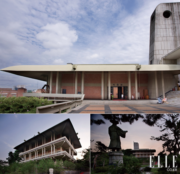 강을 끼고 있는 절벽은 참으로 묘한 뉘앙스를 풍긴다. 절두산이 그렇다. 그곳에 갈 참이면 늘상 작두에 머리를 잘린 우리나라 초기 천주교인들의 비명이 들려오는 듯하다. 그 땅에 이희태(1925?1981) 선생이 설계한 순례성당이자 순교기념관이 1967년에 건립되었다. 절두산 순교복자기념성당(이하 ‘절두산 성당’)이다. 우리나라 옛 건축의 조형언어로부터 추출된 외관이 독특한 분위기를 풍긴다. 프랑스에 르코르뷔지에가 설계한 롱샹 성당이 있다면 한국엔 이희태가 설계한 절두산 성당이 있다. 세계 중심에서 한국 건축의 위상이 변방에 머무르고 있었던 1960년대에, 당대를 풍미했던 국제주의 양식의 기능주의적 건축의 영향력에서 벗어나 건축가의 독습에 의해 자생적 모더니즘 건축의 한 사례로 탄생한 것이 이 건물이다. 더욱이 한국을 지배하던 엘리티즘에 기반한 모더니즘 건축 스타일과 전혀 다른 모습으로 탄생했다. 그런 연유로 주목되는 것이 이상할 정도인 이 건물이 1992년에는 공간사가 제정한 ‘건축25년상’을 수상했다. 지어진 지 25년이 넘은 건물 가운데 건축적 가치가 높고, 원형이 잘 보존되어 있으며, 원 목적으로 잘 사용되는 건물에 주어지는 상으로 김중업의 프랑스대사관도 수상했는데 아쉽게도 이 상은 그 후 지속되지 못한 채 사라졌다. 이희태는 동년배 건축가들처럼 일본 대학의 학벌이 있거나, 서구제국의 유학파도 아닌, 일제 하에서 국민학교를 졸업하고 가정 형편상 상급 학교로 진학을 포기한 채 곧장 직업 학교로 들어가 건축 기술 교육을 받은 것이 학력의 전부다. 정황이 이러하니 그는 평생 학력 콤플렉스를 안고 살았다. 그러나 가방끈이 짧고, 기댈 데가 없었던 까닭에 그는 누구보다도 일찍 건축설계 실무에 뛰어들었다. 스물한 살에 자기 이름을 건 설계사무소를 개업한 것이다. 절두산 성당은 직설적 표현으로 우리나라 전통 건축의 스타일을 리메이크한 것이 특징이다. 성당의 몸체와 지붕은 갓을 쓴 이 땅의 선조들을 연상시킨다 수직 종탑은 단두대의 모습이다. 초기 천주교인들이 무참히 참수당했던 한 시대, 땅의 역사를 건물의 형태로 기록한 것이다. 이러한 건축수법을 두고 유비적 건축이라고 말한다. 기념관을 받치고 있는 하부 기둥들은 경복궁 경회루 하부 돌기둥 형태의 이미지를 재현하고 있다. 그러나 오리엔탈리즘적 모더니즘 건축언어에 지배당했던 동년배 건축가들과 서구지상주의의 당대 사회 분위기에서 그의 건축언어는 ‘정통성이 결여되어 있다’는 이유로 평가 절하되었고, 1980년대 국내 건축계에서 비판의 표적이 되었던 포스트모더니즘의 선험적인 전형으로서 좋지 못한 평가를 받았던 것이다. 그러다가 90년대 이후 그의 건축이 재조명을 받게 된 이유 중 하나는 서구 건축학자 케네스 프램프턴의 비판적 지역주의에 근거한 지역성이 짙은 건축으로 이희태 건축의 특성이 부각되면서부터였다. 그 시기 대학에서는 석사학위 논문에서 이희태 연구가 붐을 이루기 시작했다. 그 과정에서 종전까지 그의 건축 세계에 대한 왜곡된 선입견이 상당 부분 걷히는 결과를 낳은 것은 천만 다행한 일이었다. 그의 건물은 독특한 비례체계를 갖는다. 제도판 하나 구하기 힘든 시절에 그는 모눈종이 위에서 설계를 진행했다. 그 시절의 많은 건축가들이 그러했겠지만 모눈종이의 그리드 체계는 그의 건축을 복잡한 도형의 세계에서 일탈하는 기회를 주었고, 그가 그리는 건축의 선들은 단순화되었다. 모눈종이의 그리드를 따라 일정 비율로 확장되는 평면과 입면의 변화는 그가 설계한 건물의 기하학적 특징을 이룸과 동시에 비례체계의 단순함을 극복하려는 건축가의 의지로 말미암아 건물의 외관을 기단-몸통-지붕이라는 고전주의 건축수법을 따라 하며 그 위에 우리나라 전통 건축의 형태미를 가미하는 방법론을 채택한다. 그런 의미에서 그의 건축을 서구 고전주의와 인본주의 건축을 잇는 르네상스 건축 스타일의 현대적 변용으로 보는 시각도 있다. 한편 이제까지 우리나라 전통 건축의 특징을 목구조 건축의 가구식 체계에서 찾아온 것이 사실이다. 그런 면에서 순교기념관의 내·외부 공간을 구축하는 조형언어는 목구조 건축의 체계를 여실히 보여준다. 벽체를 비운 채 쌍주 형식의 장식 기둥과 처마를 받치고 있는 돌출보가 그렇다. 건물의 볼륨이 약화되면서 전체적인 이미지가 가벼운 느낌을 준다. 그러나 성당의 외관은 벽돌을 쌓아 만든 묵직한 매스의 건축으로 다가온다. 성당과 기념관이 서로 다른 구축 방식을 통해 대비되고 있는 것이다. 최근 학계 일각에서는 우리나라 건축의 조영 원리로서 상고시대부터 전해 내려오는 쌓기 건축의 역사성을 조명한 저술이 주목받고 있는데, 이는 그동안 목구조 건축의 가구식 체계를 보완한다는 점에서 의미가 크다. 그 점에서 보면 일찍이 이를 간파한 이희태의 한국 건축에 대한 성찰의 깊이를 가늠할 수 있기도 하다. 그가 단순히 감각에 호소하는 형태미의 건축으로서 우리나라 건축의 특징을 수용했다는 편협된 시각을 무색케 할 정도로 이미 이 방면에서 한국 건축의 가치를 앞서 깨닫고 선도한 위대한 인물